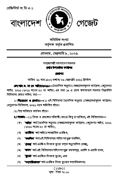 বাংলাদেশে কর্মরত এনজিওগুলোর বৈদেশিক অনুদান গ্রহণ এবং স্বেচ্ছাসেবামূলক কার্যক্রম পরিচালনার ক্ষেত্রে স্বচ্ছতা ও জবাবদিহি নিশ্চিত করতে নতুন বিধিমালা জারি করেছে সরকার। ‘বৈদেশিক অনুদান (স্বেচ্ছাসেবামূলক কার্যক্রম) রেগুলেশন বিধিমালা, ২০২৬’ শিরোনামের এই প্রজ্ঞাপনটি সোমবার (৯ ফেব্রুয়ারি) প্রধান উপদেষ্টার কার্যালয় থেকে প্রকাশিত হয়