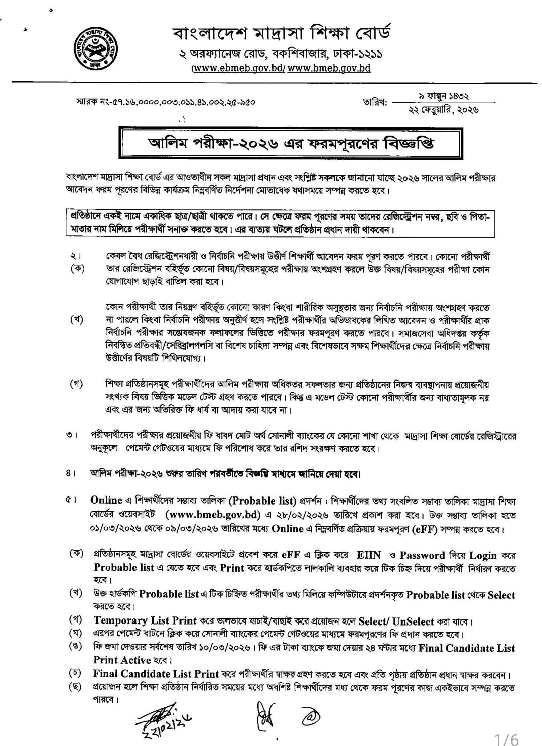 বাংলাদেশ মাদ্রাসা শিক্ষা বোর্ড ২০২৬ সালের আলিম পরীক্ষার ফরম পূরণের সময়সূচি ও নির্দেশিকা ঘোষণা করেছে । বোর্ডের ওয়েবসাইট (www.bmeb.gov.bd) এবং নির্দিষ্ট পোর্টালে এই বিজ্ঞপ্তি প্রকাশ করা হয় ।