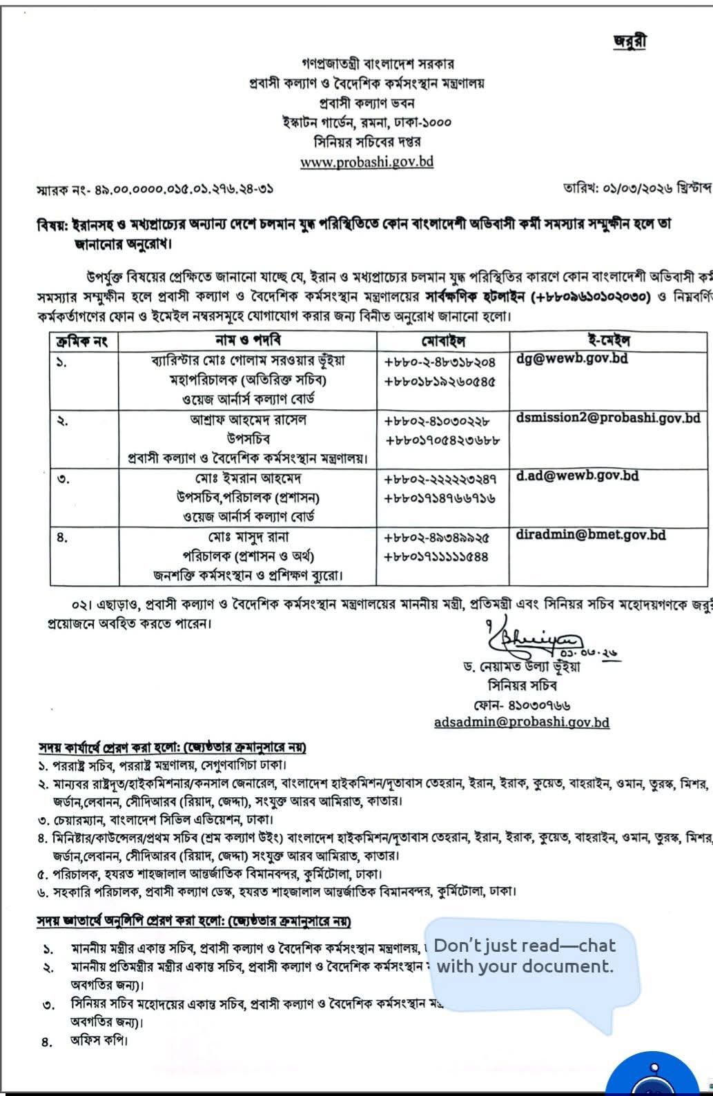 জরুরি হটলাইন ও বিশেষ সহায়তা চালু ২০২৬ । মধ্যপ্রাচ্য সংকটে প্রবাসী বাংলাদেশিদের নিরাপত্তায় সরকার?