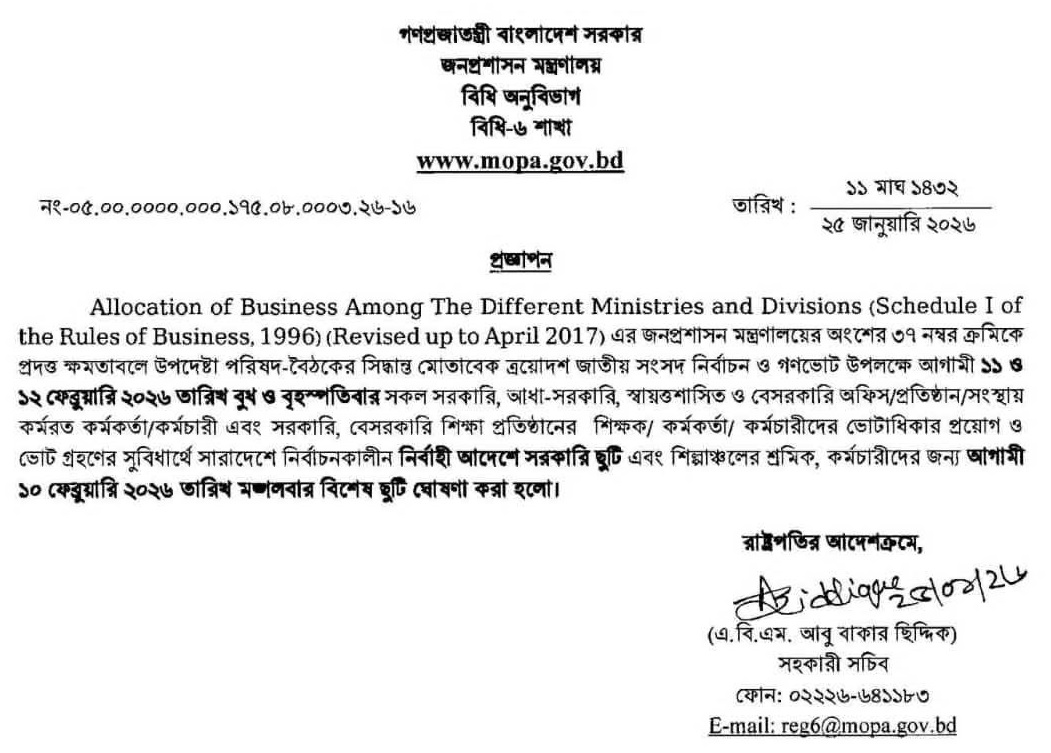 নির্বাচন ঘিরে টানা ৪ দিনের ছুটিতে দেশ: ১১ ও ১২ ফেব্রুয়ারি সাধারণ ছুটি ঘোষণা