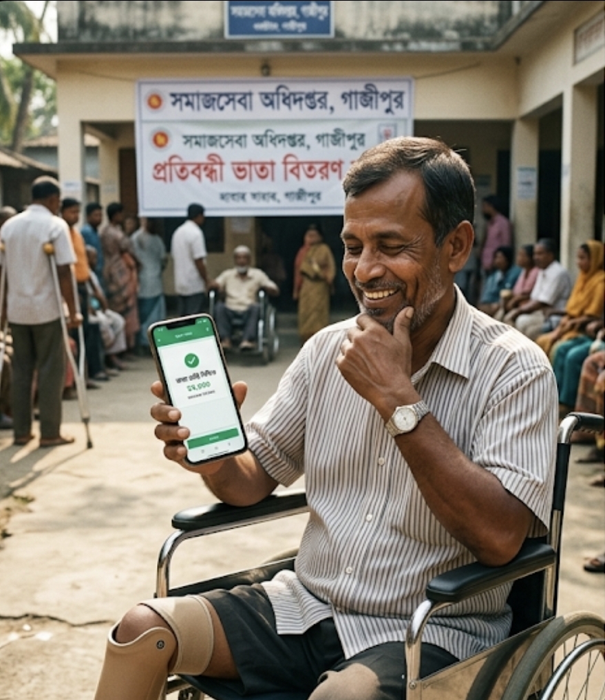 সারাদেশের ন্যায় ঢাকা বিভাগের গাজীপুরেও আজ ১২ই মার্চ (বৃহস্পতিবার) সরকারি ‘প্রতিবন্ধী ভাতা’ বিতরণ করা হয়েছে। আধুনিক ডিজিটাল পেমেন্ট সিস্টেম (G2P) পদ্ধতির মাধ্যমে সুবিধাভোগীদের মোবাইল ওয়ালেটে সরাসরি এই অর্থ পৌঁছে দেওয়া হচ্ছে।
