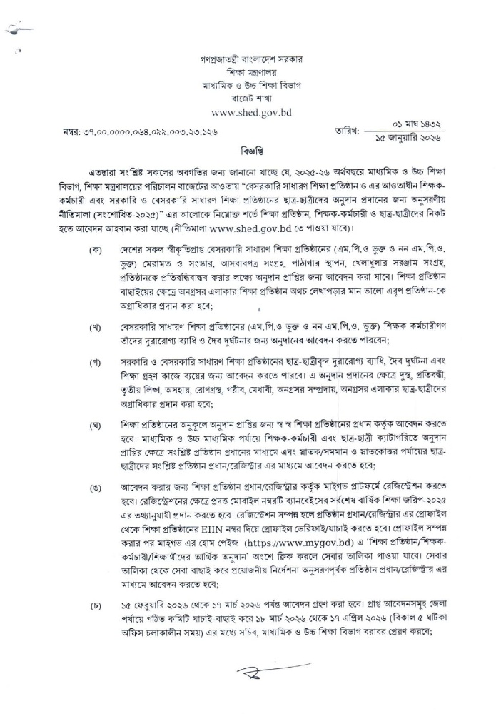 শিক্ষা মন্ত্রণালয়ের মাধ্যমিক ও উচ্চ শিক্ষা বিভাগ ২০২৫-২৬ অর্থবছরের বিশেষ অনুদান প্রদানের লক্ষ্যে আবেদন আহ্বান করেছে। দেশের সকল সরকারি ও বেসরকারি সাধারণ শিক্ষা প্রতিষ্ঠান, শিক্ষক-কর্মী এবং অসচ্ছল মেধাবী শিক্ষার্থীদের আর্থিক সহায়তা প্রদানের উদ্দেশ্যে এই উদ্যোগ নেওয়া হয়েছে।