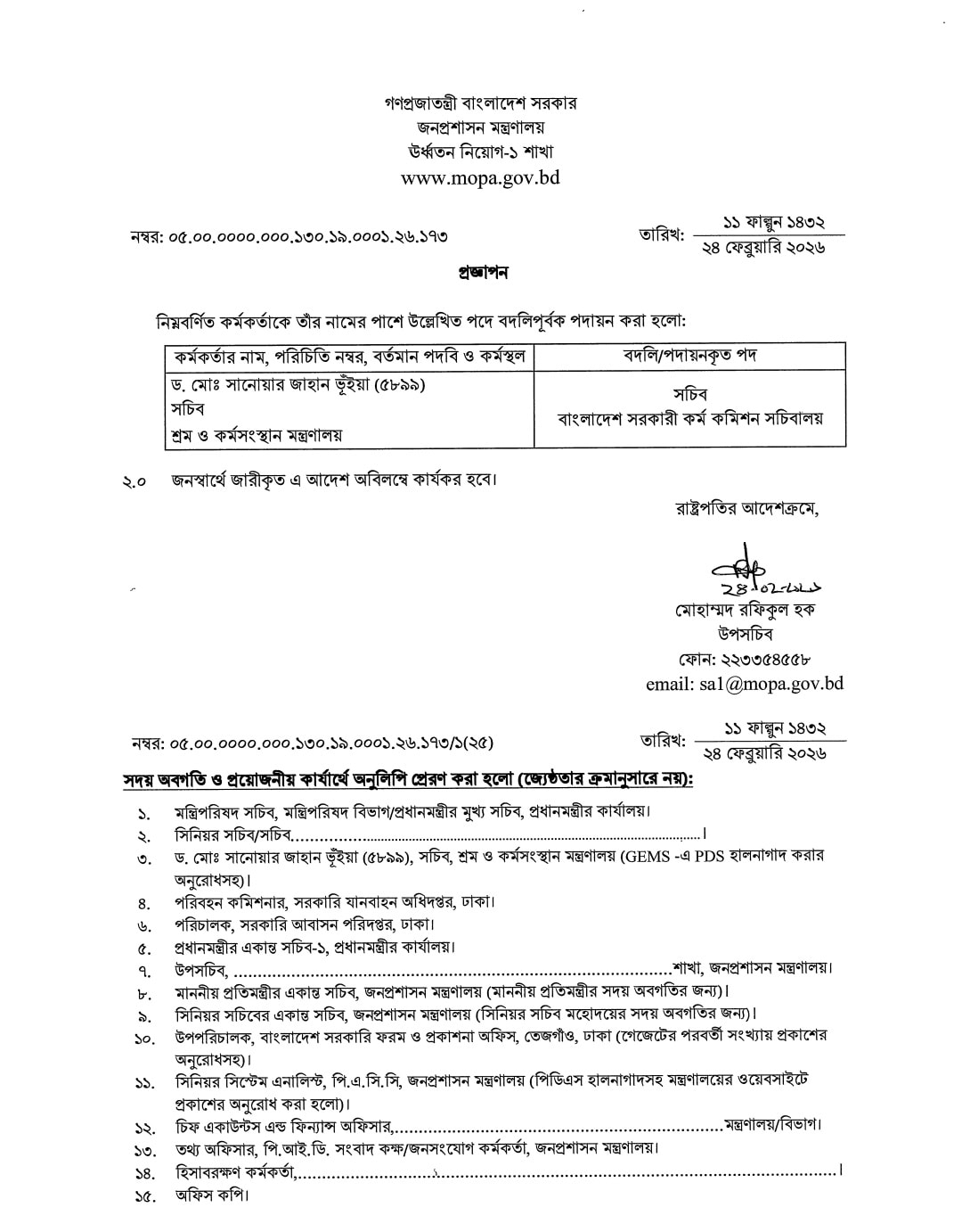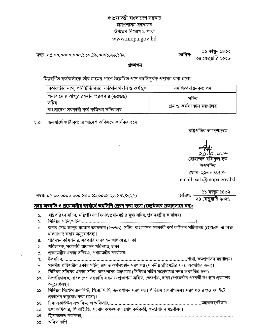 প্রশাসনে বড় রদবদল ২০২৬ । পিএসসি ও শ্রম মন্ত্রণালয়ে নতুন সচিব নিয়োগ কাকে দেয়া হলো?