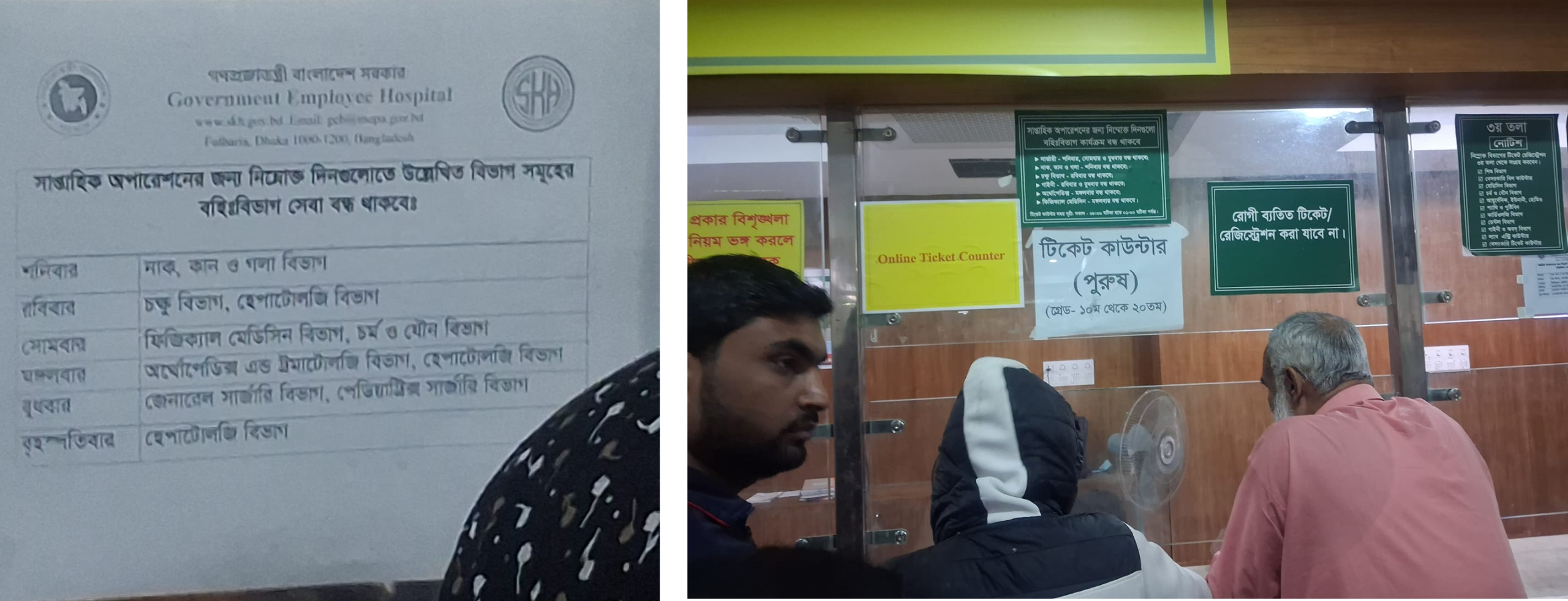 সরকারি কর্মচারী হাসপাতালে চিকিৎসা নিতে আসা রোগীদের সুবিধার্থে এবং হাসপাতালের কার্যক্রম সুশৃঙ্খল রাখতে বহিঃবিভাগ (OPD) সেবা ও টিকেট রেজিস্ট্রেশন সংক্রান্ত নতুন নির্দেশনা জারি করা হয়েছে । সাপ্তাহিক অপারেশন কার্যক্রম পরিচালনার জন্য নির্দিষ্ট কিছু দিনে বিশেষ কিছু বিভাগের বহিঃবিভাগ সেবা বন্ধ থাকবে। একইসাথে রোগীদের সুবিধার্থে ফ্লোর ভিত্তিক টিকেট কাউন্টারের তালিকা প্রকাশ করা হয়েছে।