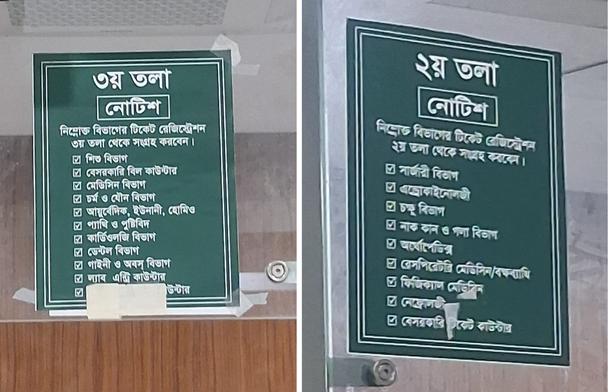 • ৩য় তলা: শিশু বিভাগ, মেডিসিন, চর্ম ও যৌন, কার্ডিওলজি, ডেন্টাল এবং গাইনী বিভাগের টিকিট এখান থেকে সংগ্রহ করতে হয়