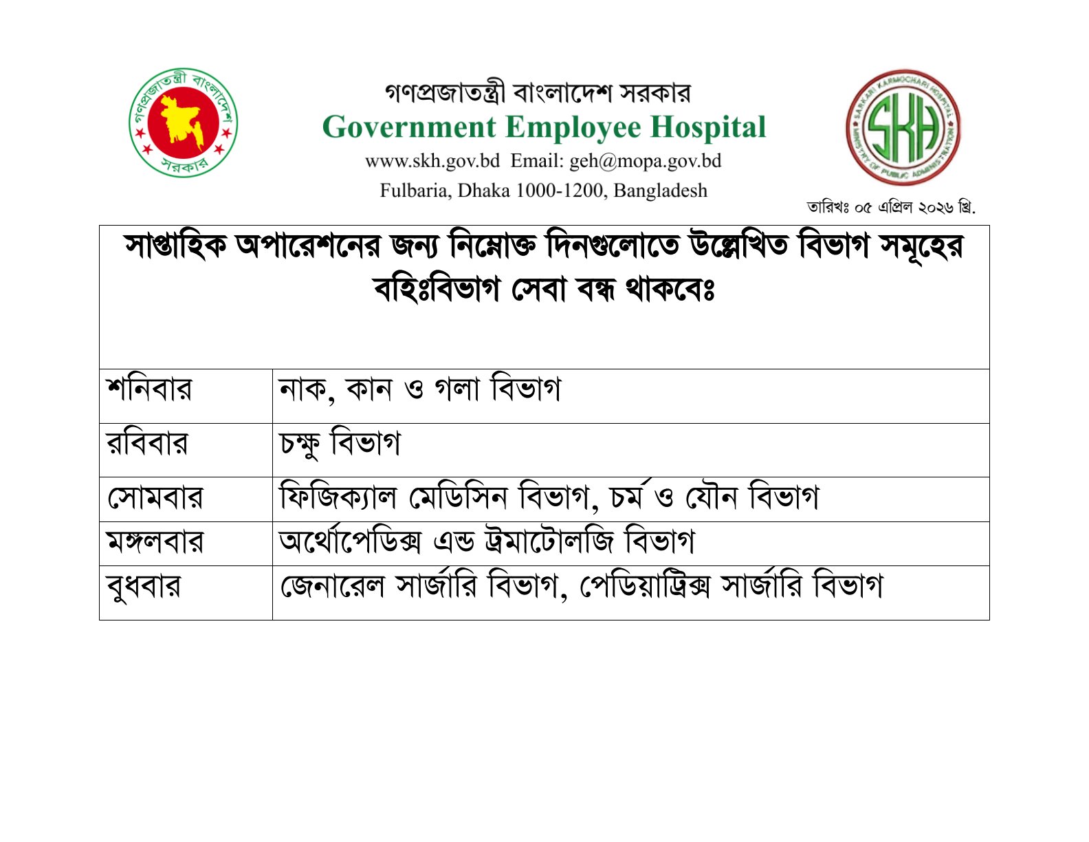 সরকারি কর্মচারী হাসপাতাল (Fulbaria, Dhaka) থেকে প্রকাশিত সাম্প্রতিক নোটিশ অনুযায়ী, সাপ্তাহিক অপারেশনের কারণে নির্দিষ্ট দিনগুলোতে নির্দিষ্ট বিভাগের বহিঃবিভাগ (OPD) সেবা বন্ধ থাকবে। অর্থাৎ, ওই দিনগুলোতে ওই সব রোগের ডাক্তাররা চেম্বারে বসবেন না।