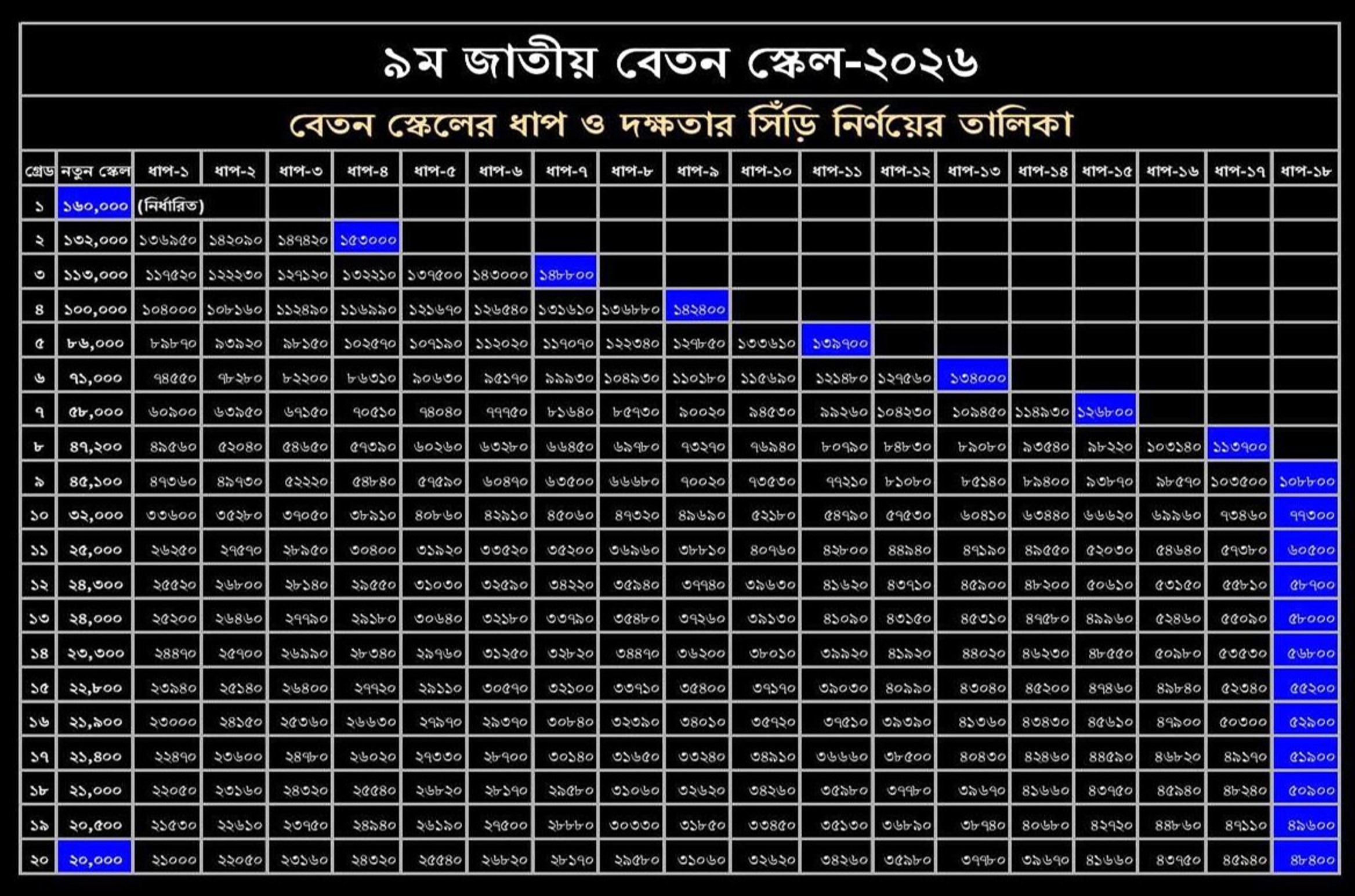 ১. বেতন কাঠামোয় বড় পরিবর্তন: সর্বনিম্ন ২০ হাজার, সর্বোচ্চ ১.৬০ লাখ