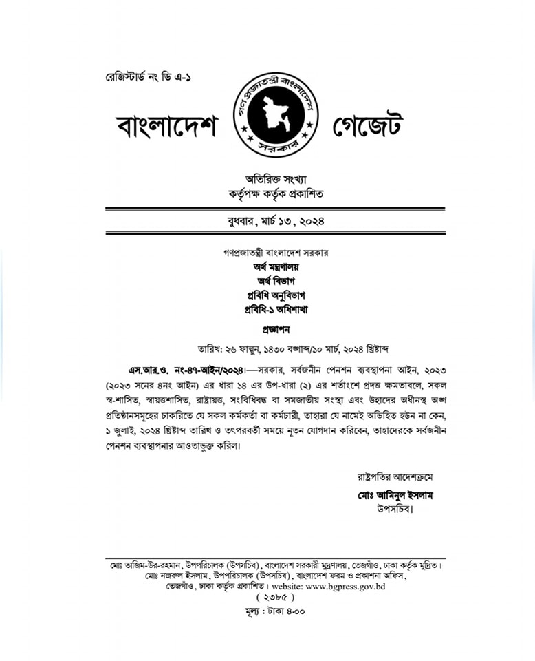 পেনশন নিয়ে নতুন আইনে কি আছে? এস.আর.ও. নং-৪৭-আইন/২০২৪ । — সরকার, সর্বজনীন পেনশন ব্যবস্থাপনা আইন, ২০২৩ (২০২৩ সনের ৪নং আইন) এর ধারা ১৪ এর উপ-ধারা (২) এর শর্তাংশে প্রদত্ত ক্ষমতাবলে, সকল স্ব-শাসিত, স্বায়ত্তশাসিত, রাষ্ট্রায়ত্ত, সংবিধিবদ্ধ বা সমজাতীয় সংস্থা এবং উহাদের অধীনস্থ অঙ্গ প্রতিষ্ঠানসমূহের চাকরিতে যে সকল কর্মকর্তা বা কর্মচারী, তাহারা যে নামেই অভিহিত হউন না কেন, ১ জুলাই, ২০২৪ খ্রিষ্টাব্দ তারিখ ও তৎপরবর্তী সময়ে নূতন যোগদান করিবেন, তাহাদেরকে সর্বজনীন পেনশন ব্যবস্থাপনার আওতাভুক্ত করা হয়েছে।